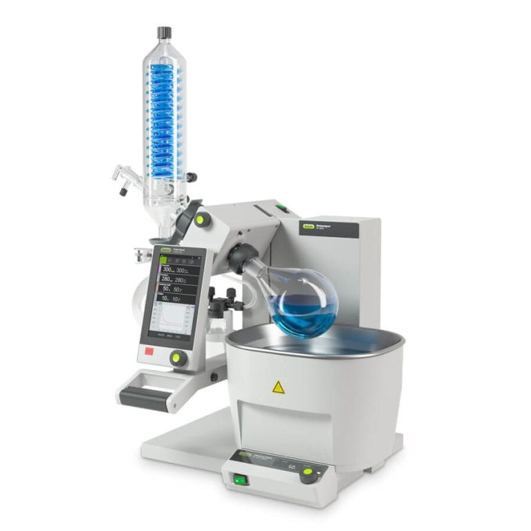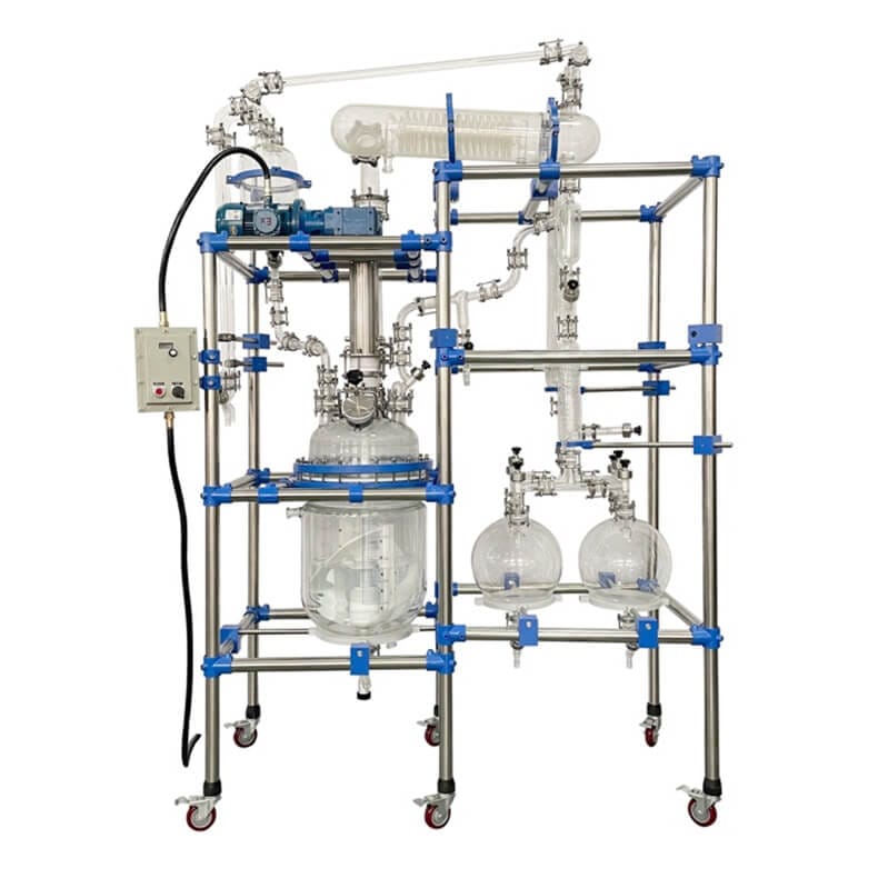O sistema inclui um reator de vidro com camisa sólida e visão total, facilitando o controle visual das reações, além de um sistema de destilação suspenso com componentes flex, que permite processos múltiplos sob vácuo total.
